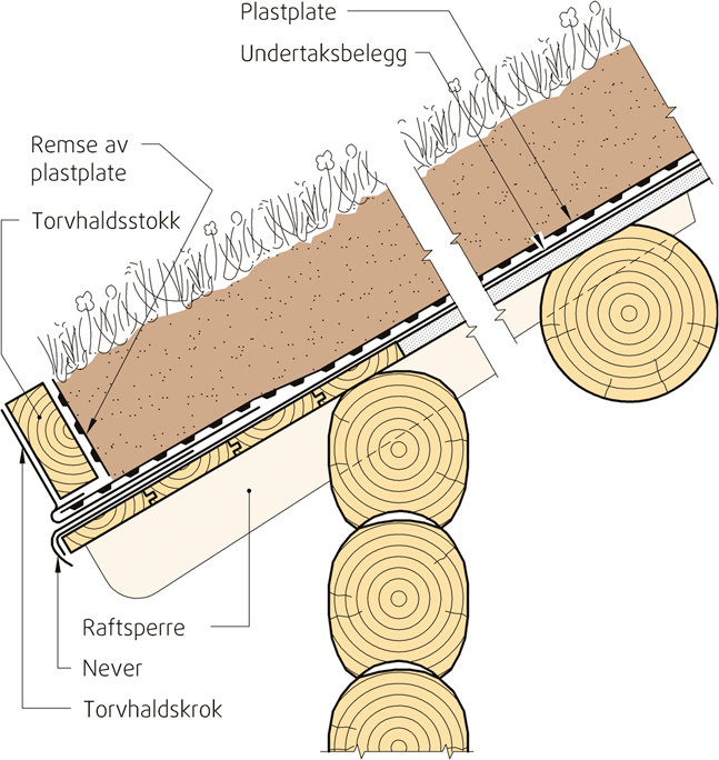 Eksempel på oppbygning av torvtak over uoppvarmet bygning. Taket har tettesjikt av undertaksbelegg og plastplate.