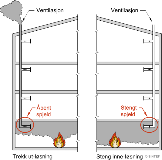 Ventilasjonsanleggets funksjon og utforming, krav til materialer, valg av type spjeld, brannisolering og generelle brannsikringstiltak er også beskrevet.