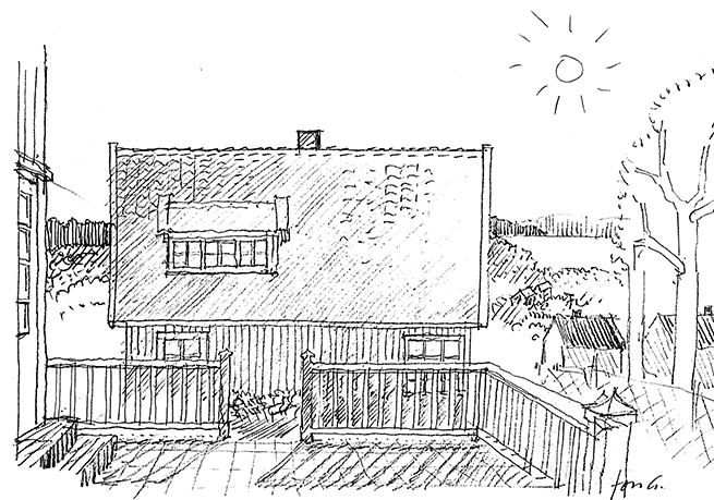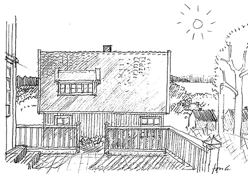 Et nytt hus midt på den opprinnelige plenen kan ta mye av sola og utsikten (Skisse: Jon Guttu, NIBR 1998)
