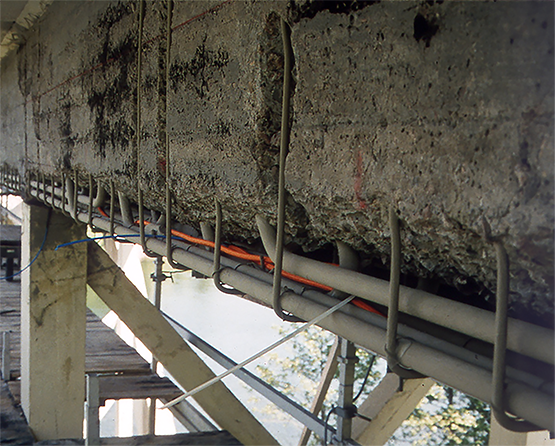 Drager på undersiden av en bro klargjort for montering av forskaling for utstøping med ny mørtel. Meislet, fjernet betong og rengjort armering med påført korrosjonsbeskyttelse. Foto: Stærk & Co AS