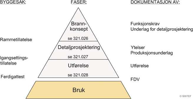 Figuren gir en oversikt over faser i byggeprosjektet som krever dokumentasjon av brannsikkerhet, og henviser til anvisninger der fasene omtales nærmere. Se også Planlegging 321.025.