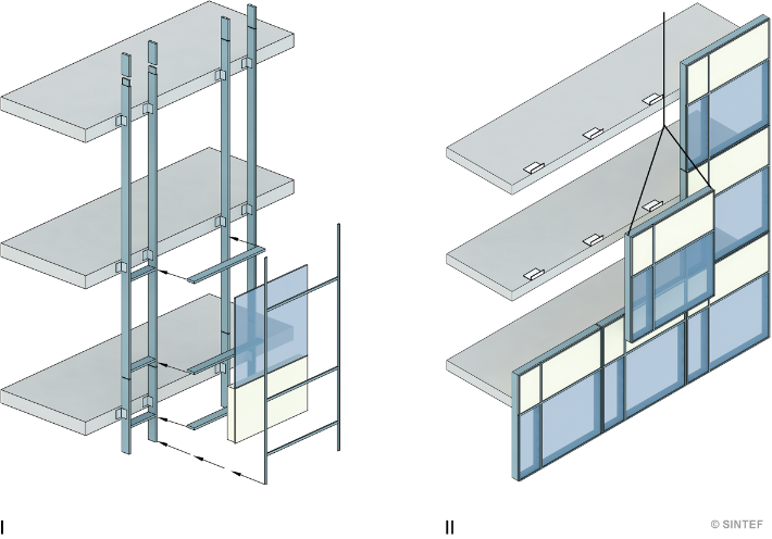 En påhengsvegg monteres på utsiden av bygningens bæresystem som en kontinuerlig «gardin» over flere etasjer. Prinsippskisse