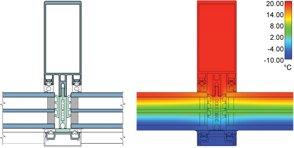 Varmetap gjennom isolerruter satt inn i et profilsystem. Fordi profilet som vist i figuren har lav U-verdi, er det liten forskjell i temperaturlinjene over profilet. Illustrasjon: Schüco