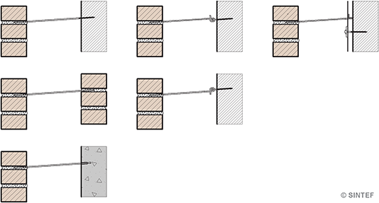 Det fins i hovedsak tre ulike forankringssystemer, avhengig av hvordan trådbinderne festes til bakveggen. Se tabell 16. Hvilket forankringssystem man skal bruke, avhenger av hvilke påkjenninger man kan forvente på trådbinderen. Se pkt. 5 om belastninger.