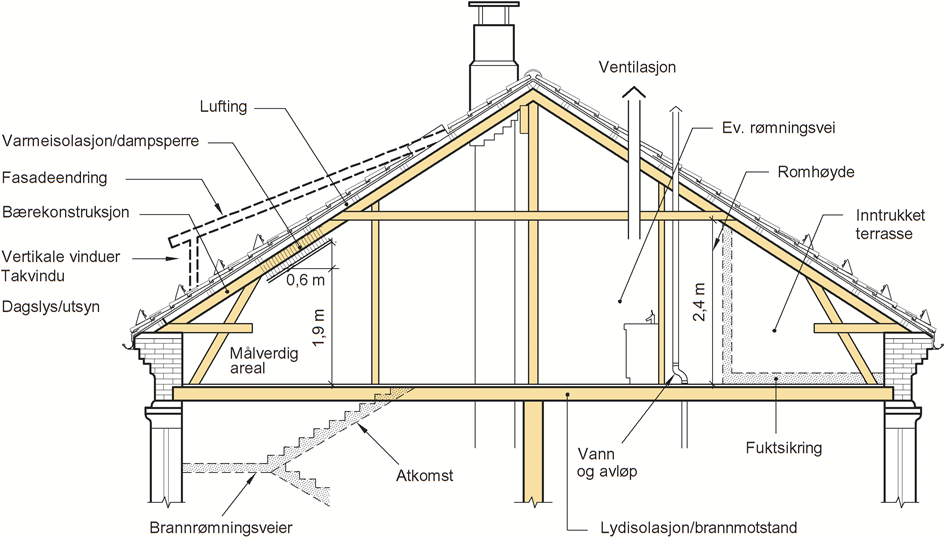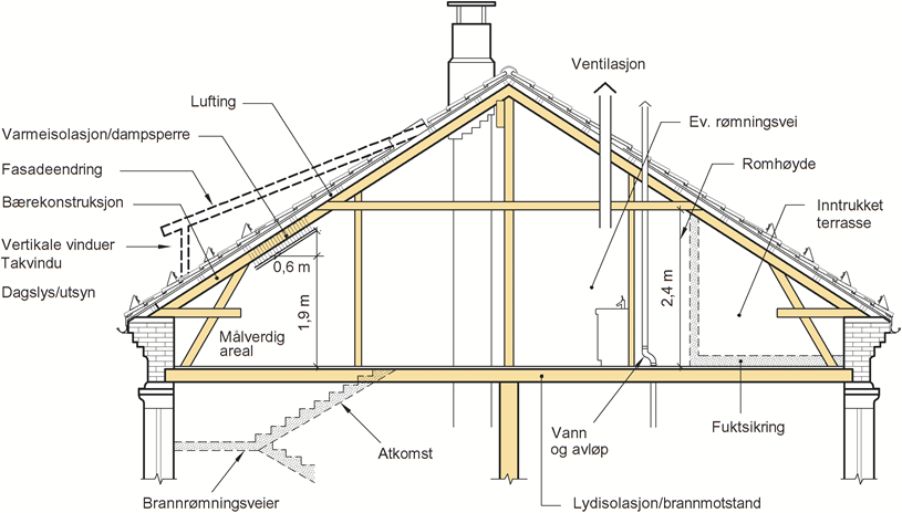 Eksempel på forhold som må vurderes ved ombygging av råloft til loftsleilighet, og som man må finne tekniske løsninger for